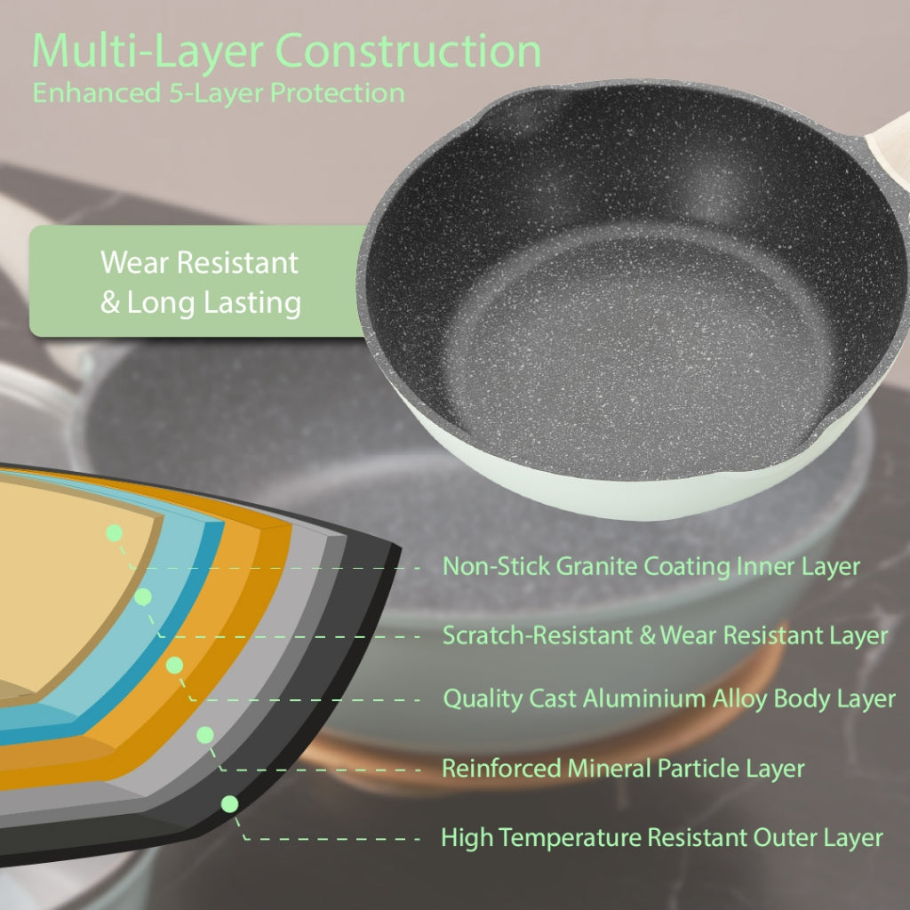 The non-stick coating is reinforced with multiple layers to enhance its longevity and performance. This reinforcement often includes additional materials that make the coating more resilient and less prone to wear and tear.